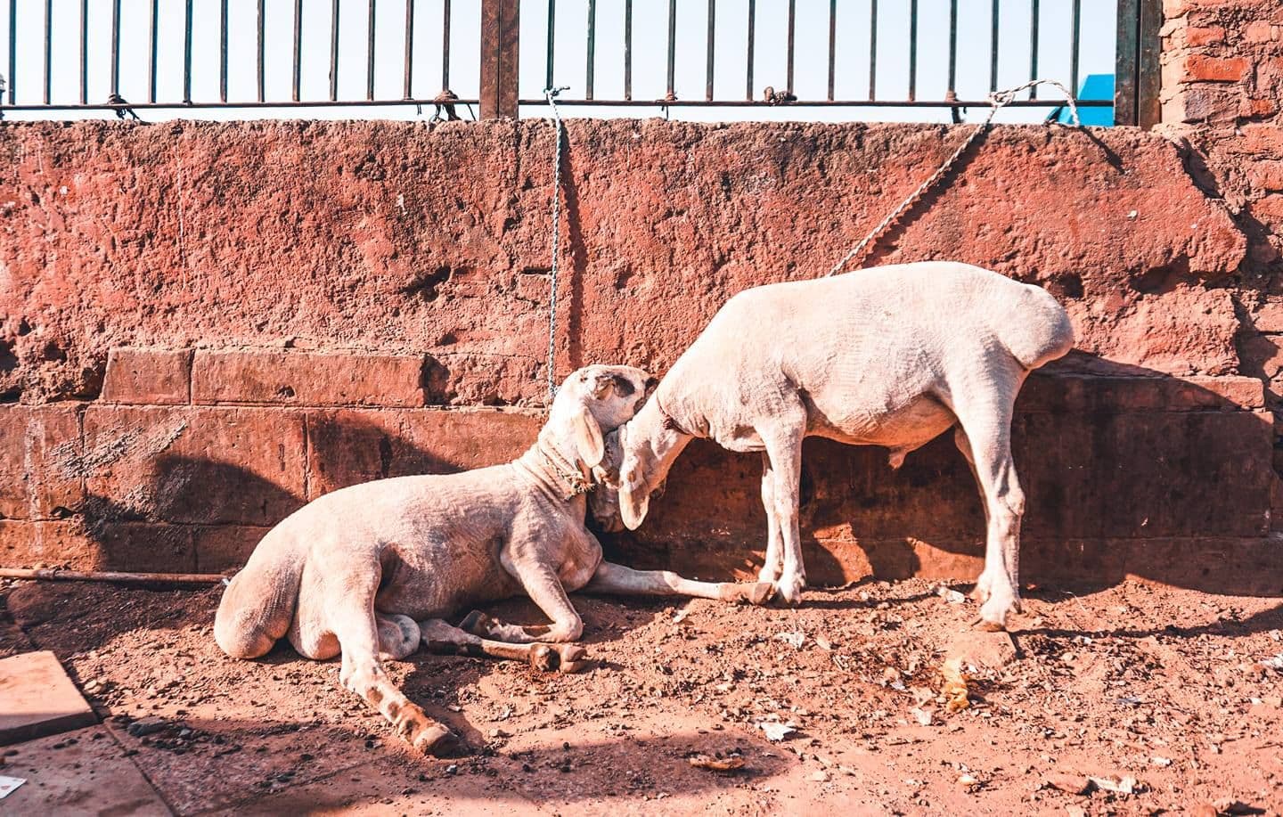 Though animals cannot express their feelings linguistically, they express their emotions through actions. The two goats, bound with ropes, stand timidly in scorching heat. They care for each other and their affection is shown with their actions. Despite the fact that they are bound, they support each other.