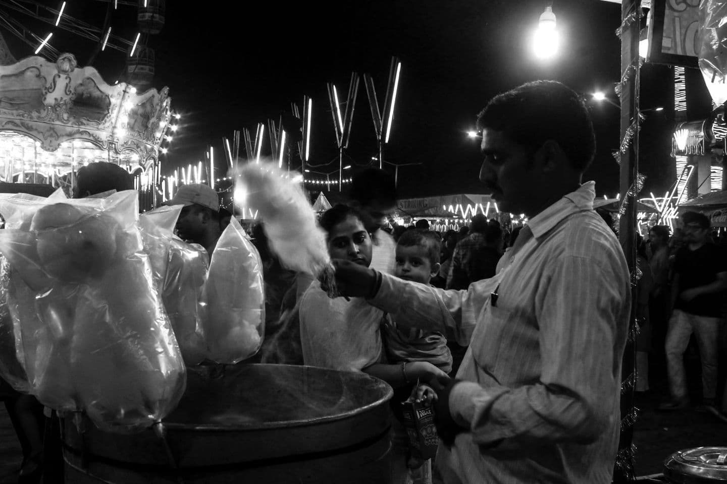 Fairs bring fun, frolic, feasts and feistas. Amidst all the chaos and madness here comes our cotton candy vendor spreading smiles wherever he goes. Sweet, fluffy and pink both the candy and the chubby cheeks of the kids relishing it.This is what he lives on , ironically selling candy to other children when his own are hungry at home. It is no longer sweet for them because they know what living on a hungry stomach is."